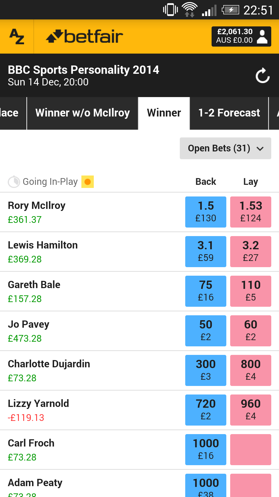 I was happy enough with my green positions on both the main contenders but tipped the balance slightly more towards Lewis just before the off. I wish I’d trusted the polls a bit more though and gone in a bit harder. There now seems a rule of SPOTY to adhere to: essentially lay any major winning golfer.