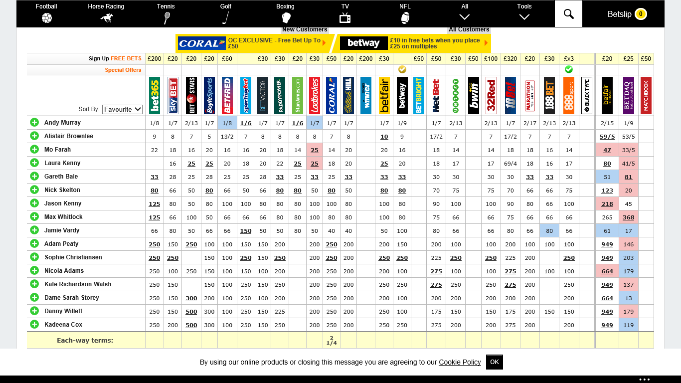 Brownlee traded at a low of 3.05 before Murray became no.1, Farah also 3.05 after winning double gold, Laura Kenny 6.0, Skelton 8.6, Vardy 3, Jason Kenny 7.0, Whitlock 6.4, Peaty 10.0, Willett 6.2.